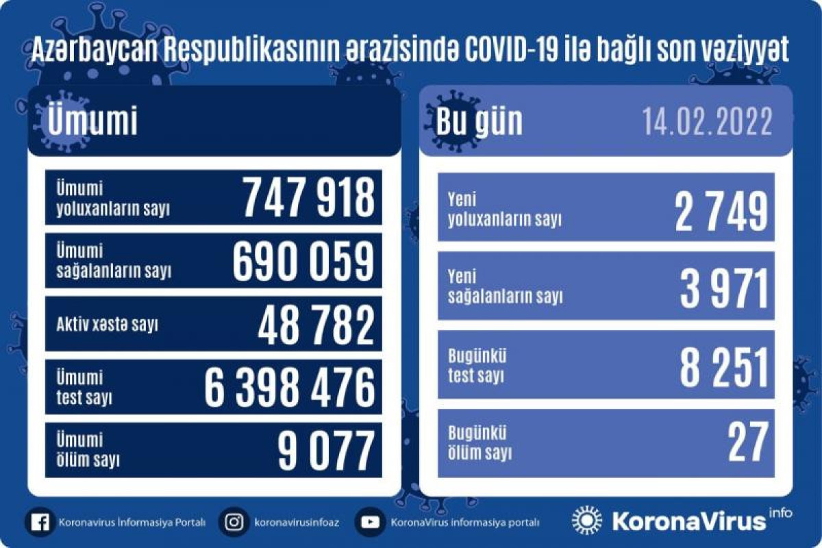 Azərbaycan Respublikasında koronavirus (COVID-19) infeksiyasına 2749 yeni yoluxma faktı qeydə alınıb, 3 971 nəfər müalicə olunaraq sağalıb.