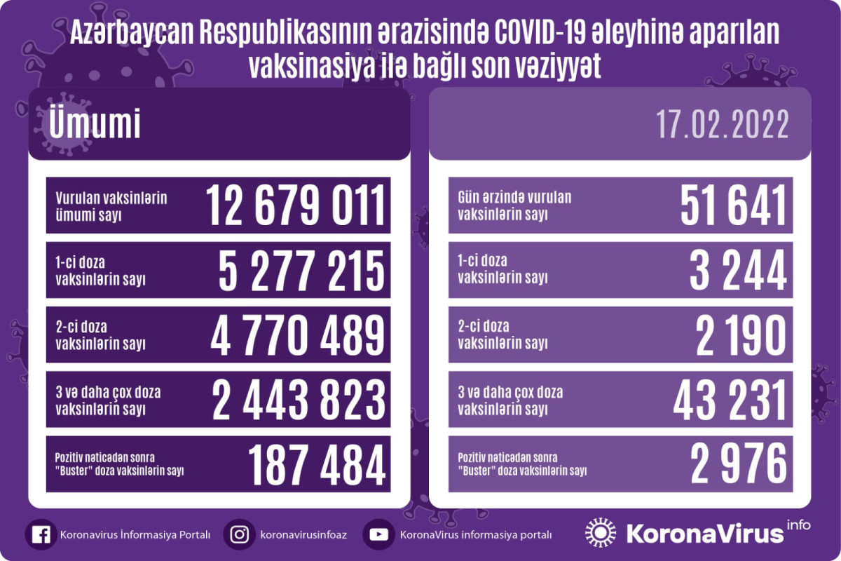 Azərbaycanda son sutkada koronavirus (COVID-19) əleyhinə 51 641 vaksin vurulub. Bir gündə birinci mərhələ üzrə vaksinasiya olunanların sayı 3244, ikinci mərhələ üzrə vaksinasiya olunanların sayı 2190, üç və daha çox doza vaksinlərin sayı 43 231, pozitiv nəticədən sonra "buster" doza vaksinlərin sayı 2976-dır.