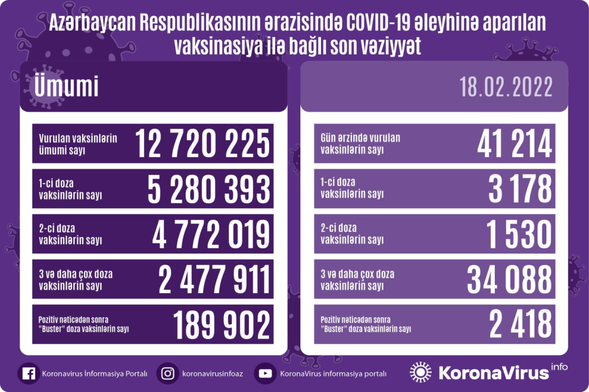 Azərbaycanda son sutkada koronavirus (COVID-19) əleyhinə 41214 vaksin vurulub. Bir gündə birinci mərhələ üzrə vaksinasiya olunanların sayı 3178, ikinci mərhələ üzrə vaksinasiya olunanların sayı 1530, üç və daha çox doza vaksinlərin sayı 34 088, pozitiv nəticədən sonra "buster" doza vaksinlərin sayı 2418-dir.