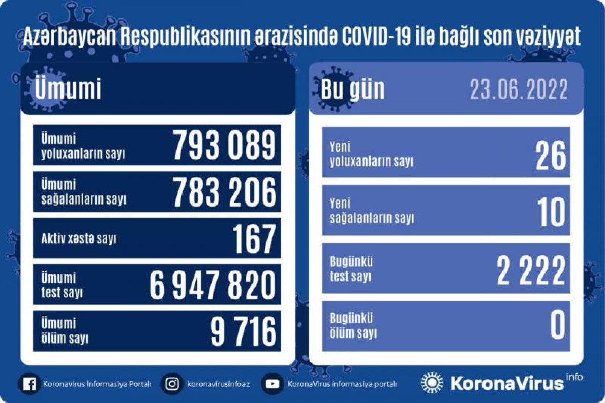 Azərbaycan Respublikasında koronavirus (COVID-19) infeksiyasına 26 yeni yoluxma faktı qeydə alınıb, 10 nəfər müalicə olunaraq sağalıb.