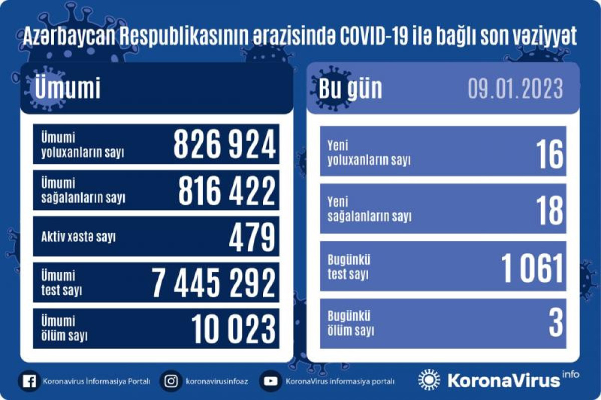 3 nəfər vəfat edibAzərbaycan Respublikasında koronavirus (COVID-19) infeksiyasına 16 yeni yoluxma faktı qeydə alınıb, 18 nəfər müalicə olunaraq sağalıb.